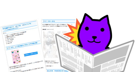 毎月第1火曜日に配信されるクター情報満載の「ギガ連射マガジン」では、 クター関連のニュースをいち早くお届け! 最新情報や新作公開のお知らせやクターの秘密を教えちゃう「なるほど!クター」や 「みんなのコーナー」などなど内容盛りだくさん! さらにメルマガ読者だけがもらえちゃう限定プレゼントギガ・レアカベガミもあり! 登録はもちろん無料、バシバシ登録してくださいな! アプリ「クター ワンダホー!」でも読めちゃうよ!!